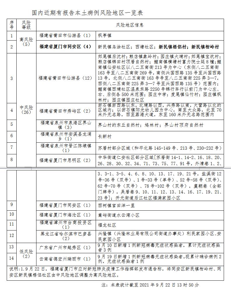 9月22日,福建省厦门市应对新冠肺炎疫情工作指挥部发布通告称,将同安区新民镇柑岭村、同安区新民镇梧侣社区由中风险地区调整为高风险地区。