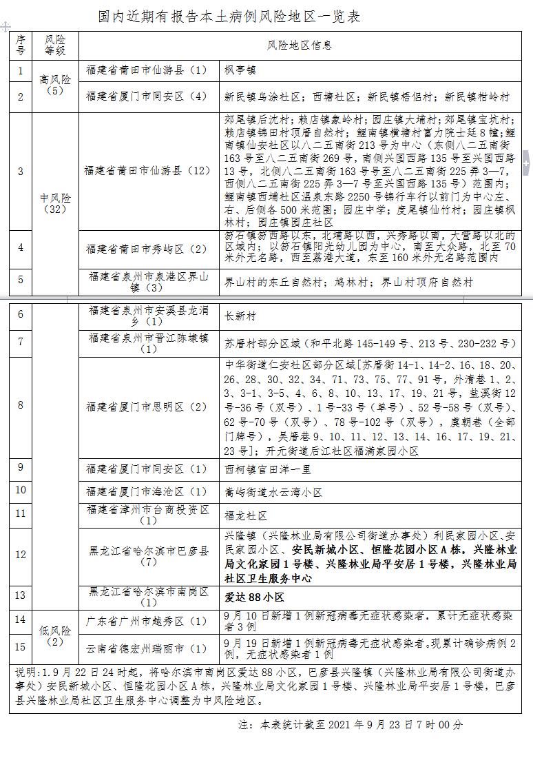 9月22日24时起,将哈尔滨市南岗区爱达88小区、巴彦县兴隆镇(兴隆林业局有限公司街道办事处)安民新城小区、恒隆花园小区A栋、兴隆林业局文化家园1号楼、兴隆林业局平安居1号楼、巴彦县兴隆林业局社区卫生服务中心调整为中风险地区。