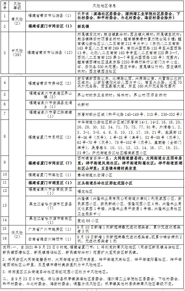 自2021年9月23日0时起,福建省厦门市将划定的高风险地区(同安区新民镇乌涂社区、新民镇西塘社区、新民镇梧侣社区、新民镇柑岭村)范围扩大至同安区新民镇。将同安区大同街道碧岳村、大同街道古庄顶布房里、祥平街道凤岗社区、祥平街道阳翟社区、祥平街道西湖社区山坪里、五显镇布塘村美安里、湖里区江头街道吕岭社区彩虹花园小区划为中风险地区。