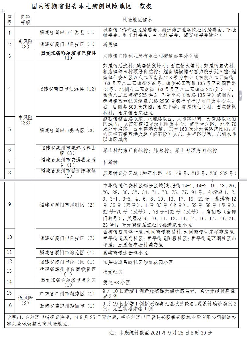 9月25日0时起,哈尔滨市指挥部将巴彦县兴隆镇兴隆林业局有限公司街道办事处全域调整为高风险地区。其他地区风险等级不变。