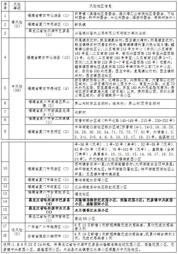 9月25日24时起,黑龙江省哈尔滨市将巴彦县兴隆镇浩鹏世纪花园小区、恒隆花园小区、巴彦镇中兴家园小区、盛隆国际小区;木兰县木兰镇香江水岸小区调整为中风险地区。其他地区风险等级不变。