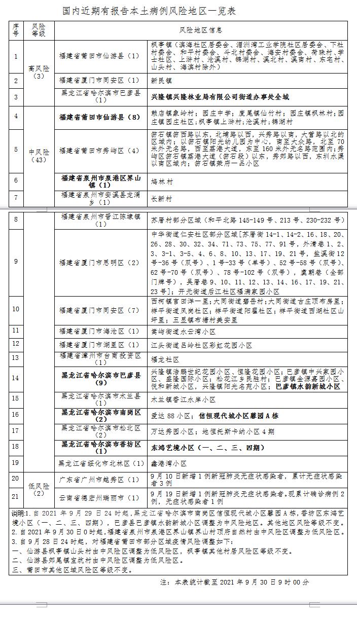 自2021年9月30日0时起,福建省泉州市下调1处中风险地区:泉港区界山镇界山村顶府自然村由中风险区调整为低风险区;自9月28日24时起,福建省莆田市下调2处中风险地区:莆田市仙游县枫亭镇山头村由中风险区调整为低风险区、仙游县郊尾镇宝坑村由中风险区调整为低风险区。