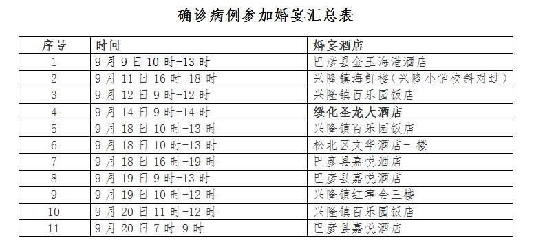 9月9日,道外区先锋路宝骏汽车4S店和领克4S店,松北区松花江服务站,南岗区哈西大玩家电玩城,张亮麻辣烫,水知润,龙成宾馆,巴彦县兴隆林业局超速网吧,闫老二烧烤(兴隆林业局小学旁边)。