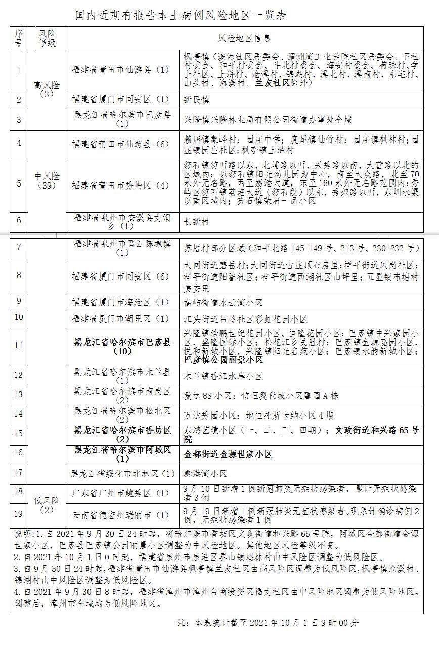 自2021年9月30日24时起,哈尔滨市将香坊区文政街道和兴路65号院,阿城区金都街道金源世家小区,巴彦县巴彦镇公园丽景小区调整为中风险地区。