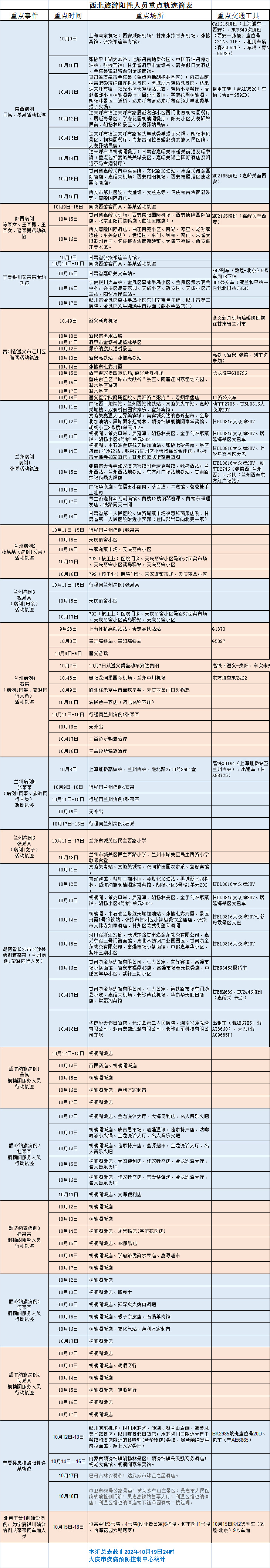近日,陕西省西安市、甘肃兰州市、贵州遵义市、湖南长沙市、内蒙古阿拉善盟、宁夏银川市等地通报多例游客及密切接触者核酸检测阳性,现将西北旅游阳性人员重点轨迹汇总如下: