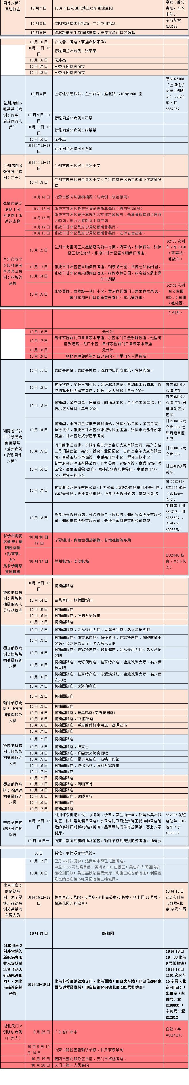 10月20日,湖北省天门市新增2例外省输入本地新冠肺炎确诊病例(两人行动轨迹相同),2人为广东省广州市人,病例分型分别为轻型和普通型;湖南省长沙市雨花区新增报告1例外省旅游返长新冠病毒核酸阳性检测者,系集中隔离管理人员中发现,10月10日-17日曾在宁夏银川、内蒙古额济纳旗、甘肃张掖等多地旅游;甘肃省张掖市市疾控中心10月19日在对兰州确诊阳性病例张某的密接人员核酸检测中,检出1例阳性人员,诊断为新冠肺炎病例(轻型);甘肃省兰州市安宁区10月19日对新冠肺炎确诊病人(D2746次列车6车厢张某)的密切接触者李某某进行追踪排查时,李某某核酸检测阳性。