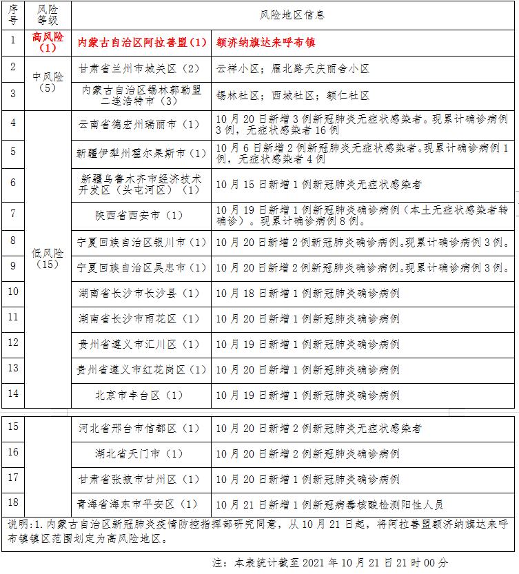 内蒙古自治区新冠肺炎疫情防控指挥部研究,从10月21日起,将阿拉善盟额济纳旗达来呼布镇镇区范围划定为高风险地区。其他地区风险等级不变。