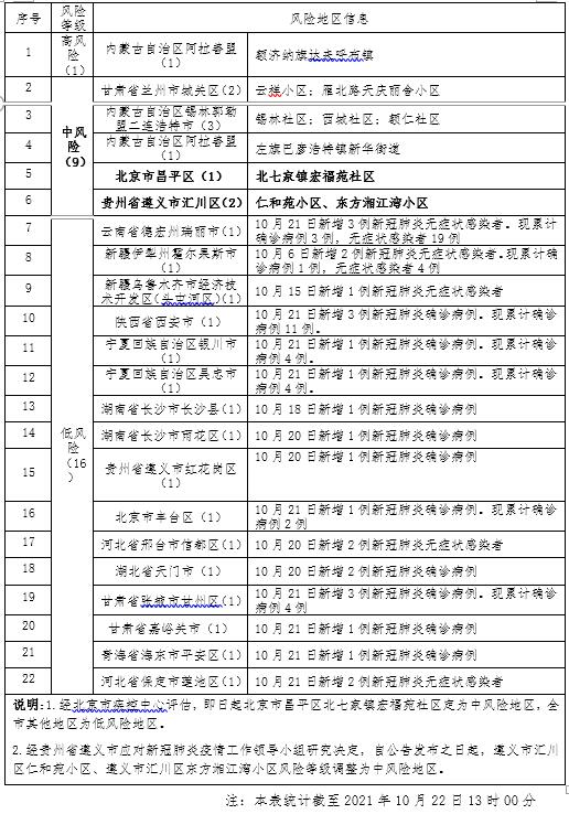 10月22日,经北京市疾控中心评估,即日起北京市昌平区北七家镇宏福苑社区定为中风险地区;10月22日,遵义市应对新冠肺炎疫情工作领导小组发布通告,自公告发布之日起,遵义市汇川区仁和苑小区、遵义市汇川区东方湘江湾小区风险等级调整为中风险地区。其他地区风险等级不变。