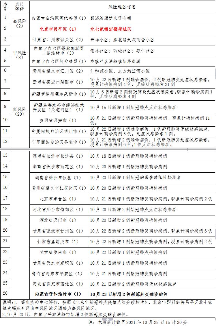 10月23日,北京市新型冠状病毒肺炎疫情防控工作第245场新闻发布会发布,经北京市疾控中心评估,按照《北京市新冠肺炎疫情风险分级标准》,将昌平区北七家镇宏福苑社区由中风险地区调整为高风险地区。其他地区风险等级不变。