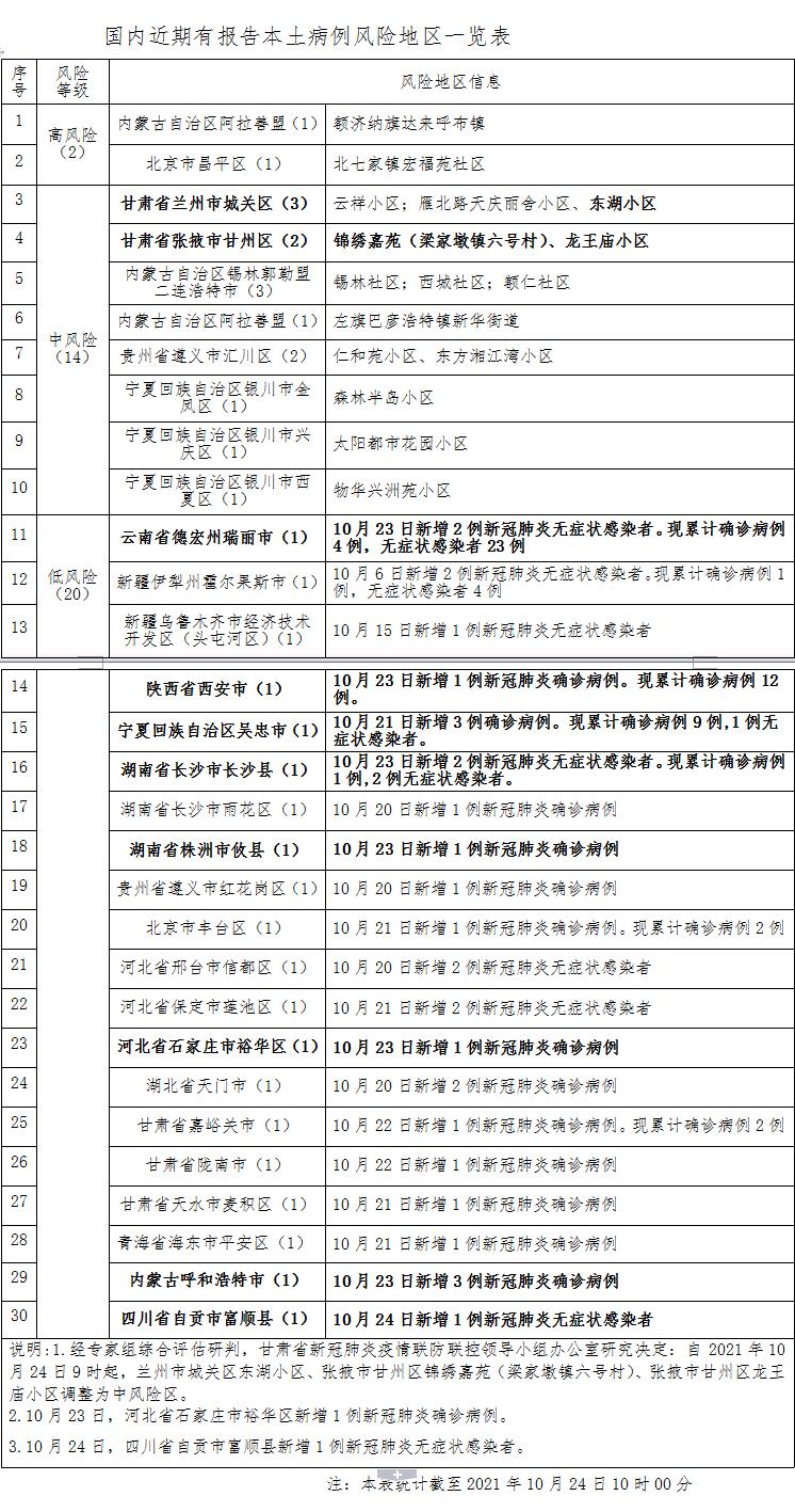 自2021年10月24日9时起,兰州市城关区东湖小区、张掖市甘州区锦绣嘉苑(梁家墩镇六号村)、张掖市甘州区龙王庙小区调整为中风险区。其他地区风险等级不变。