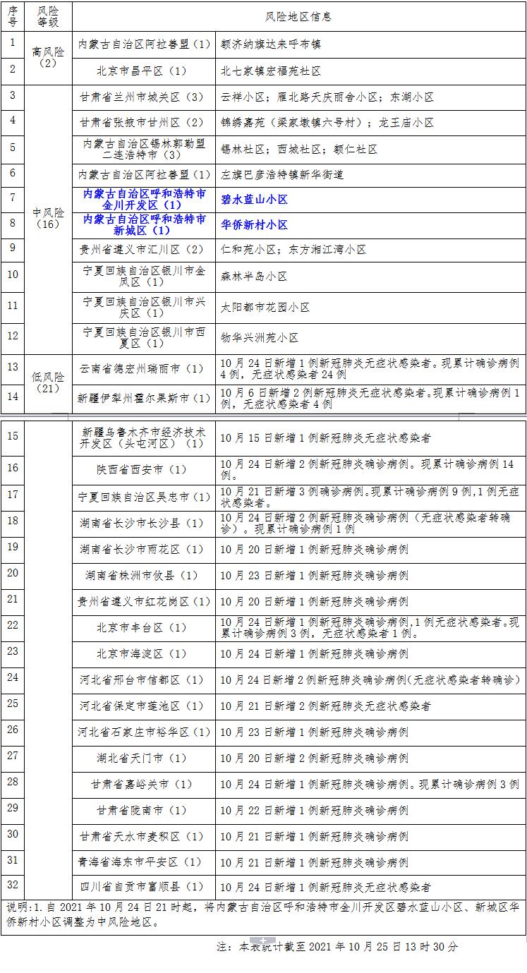 自2021年10月24日21时起,内蒙古自治区呼和浩特市金川开发区碧水蓝山小区、新城区华侨新村小区调整为中风险地区。其他地区风险等级不变。