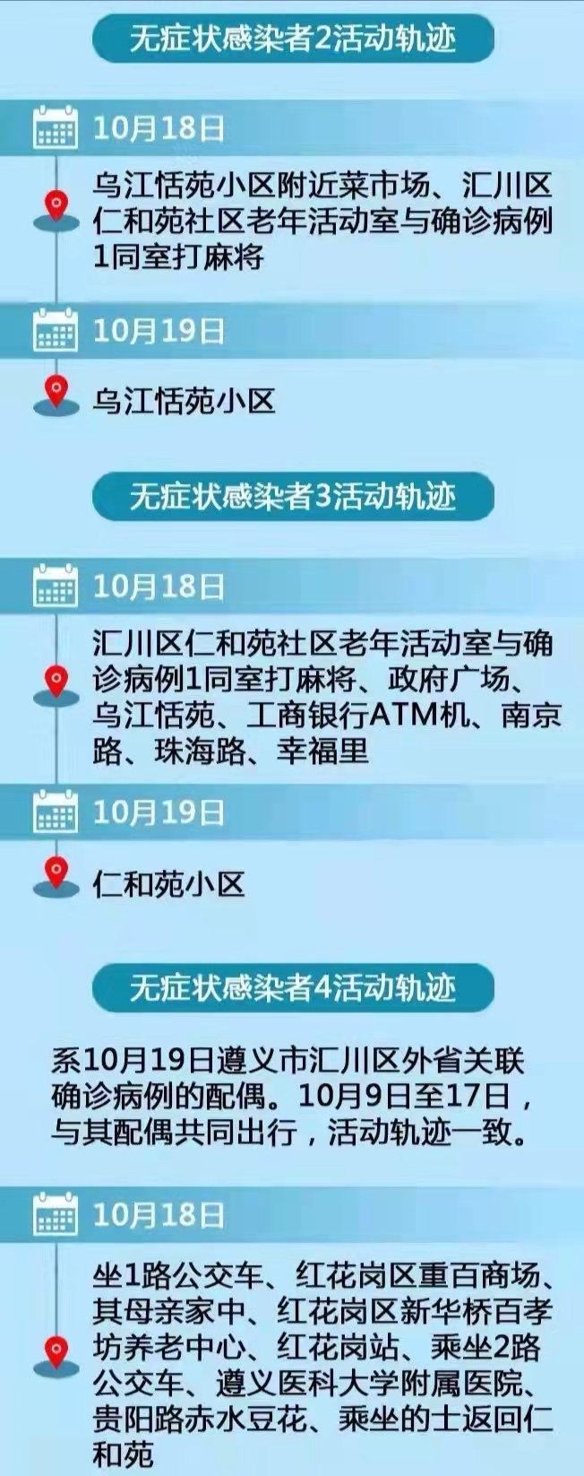 10月25日,遵义市汇川区外省关联确诊病例的已集中隔离的密切接触者核酸检测发现1例阳性。经专家会诊,诊断为新冠病毒无症状感染者。