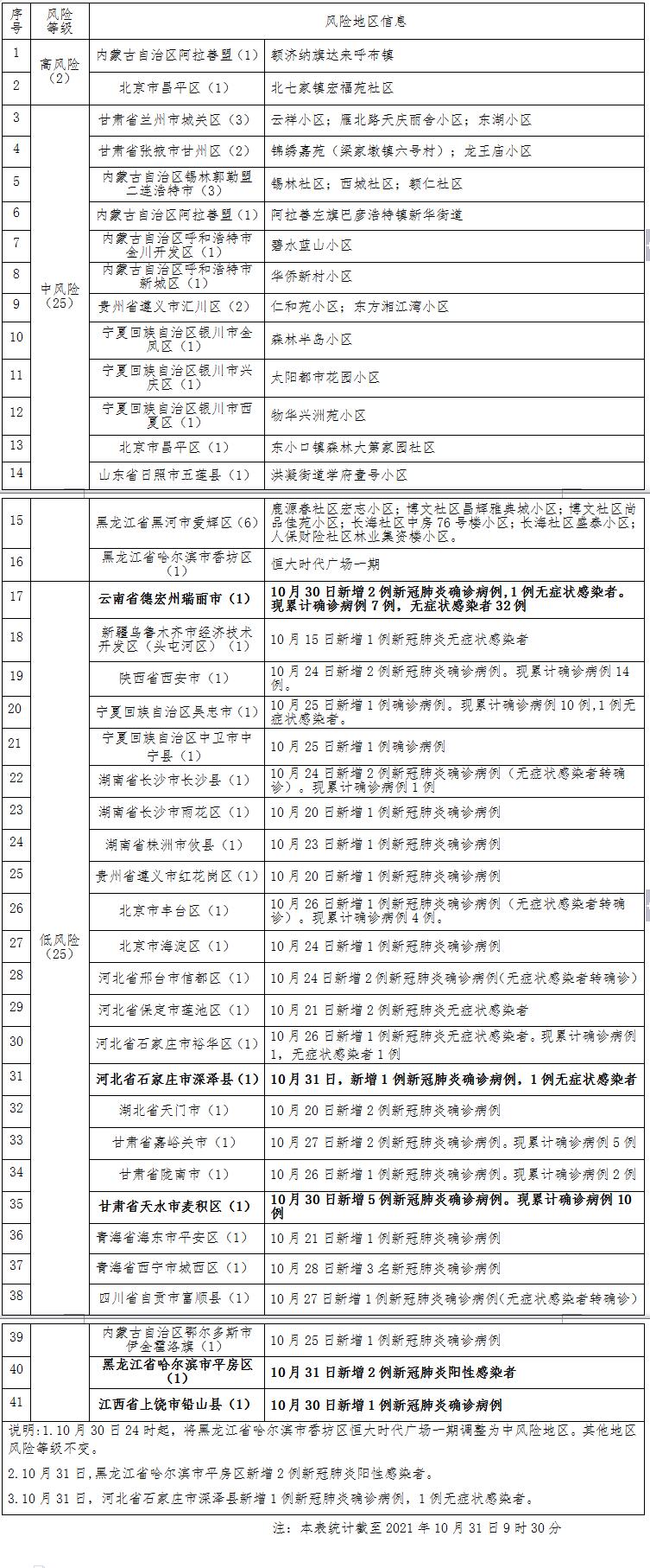 10月30日24时起,哈尔滨市香坊区恒大时代广场一期调整为中风险地区。其他地区风险等级不变。