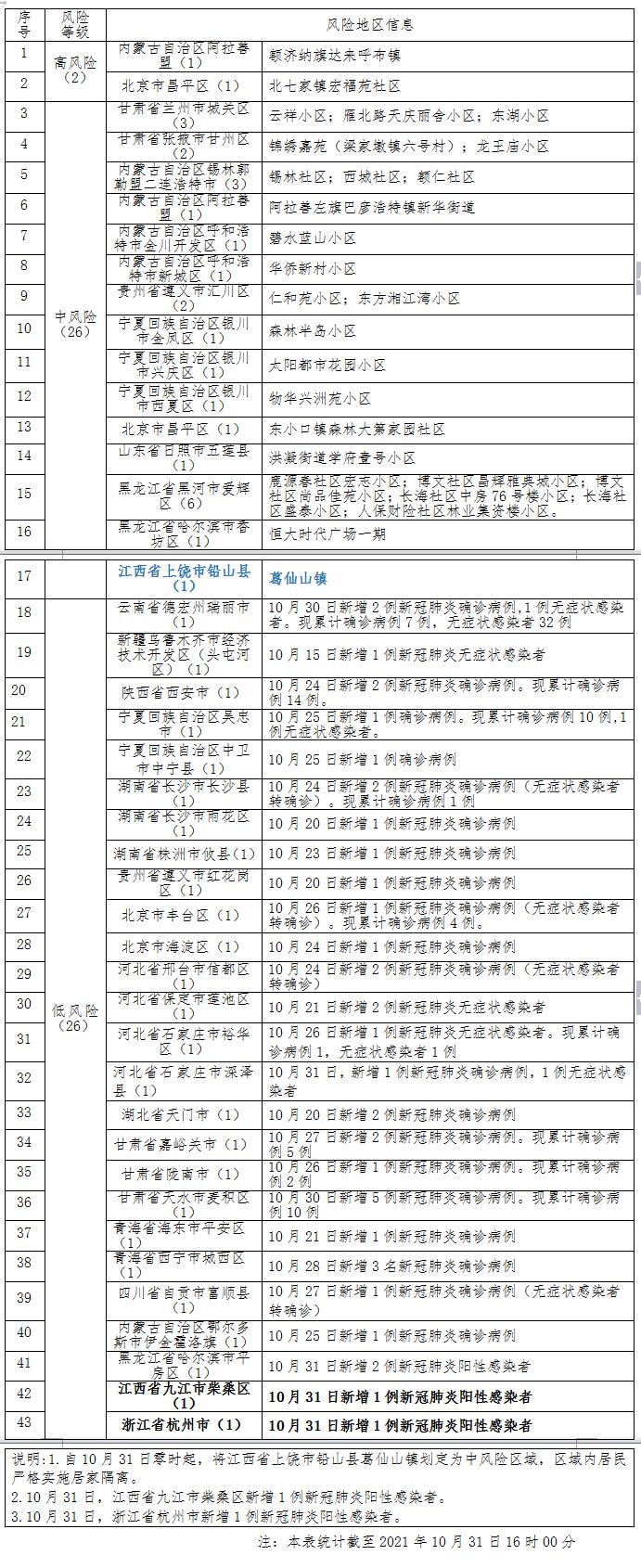 10月31日,江西省上饶市疫情防控应急指挥部发布,自10月31日零时起,将上饶市铅山县葛仙山镇划定为中风险区域。其他地区风险等级不变。