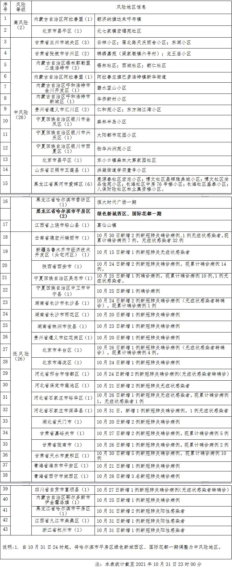 10月31日,哈尔滨市应对新冠肺炎疫情工作指挥部发布,自10月31日24时起,将哈尔滨市平房区绿色新城西区、国际花都一期调整为中风险地区。其他地区风险等级不变。