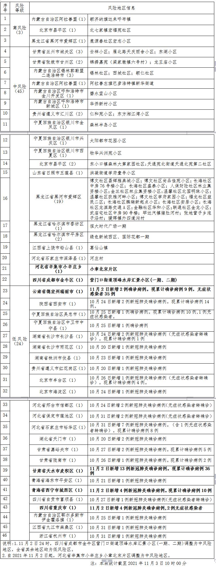 11月2日24时,四川省成都市金牛区营门口街道顶峰水岸汇景小区(一期、二期)调整为中风险地区,四川省其余地区均为低风险区。