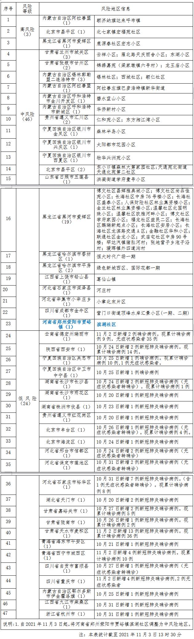 11月3日,郑州市新冠肺炎疫情防控指挥部决定,自2021年11月3日起,将荥阳市贾峪镇滨湖社区调整为中风险地区。其他地区风险等级不变。