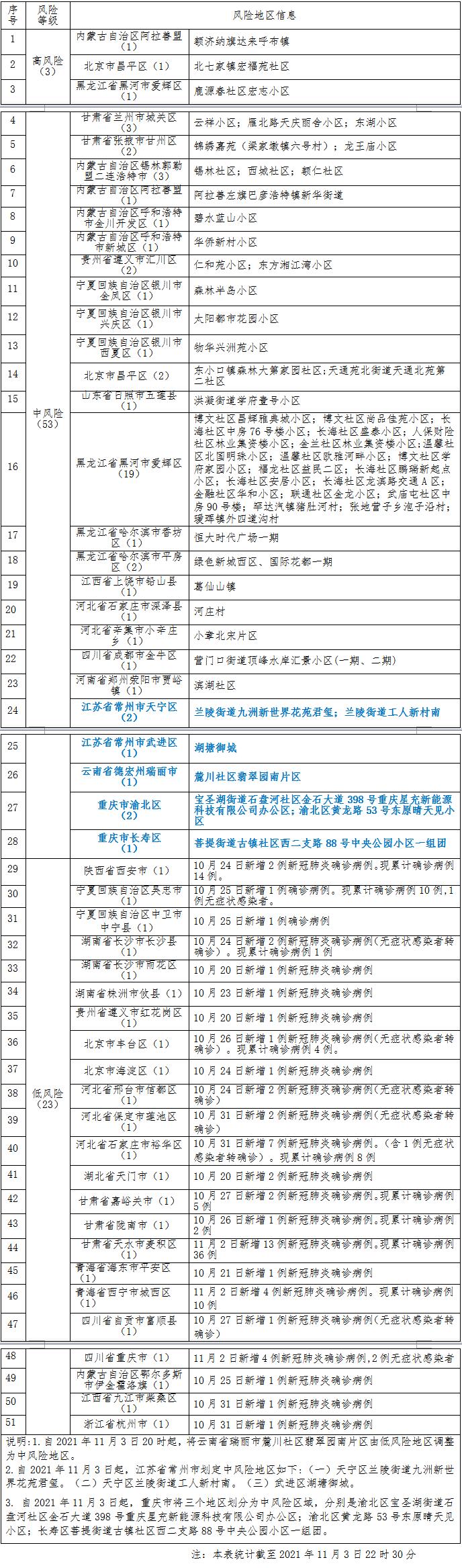 云南省德宏州瑞丽市新冠肺炎疫情防控工作指挥部通告,自11月3日20时起,将云南瑞丽市麓川社区翡翠园南片区由低风险地区调整为中风险地区。