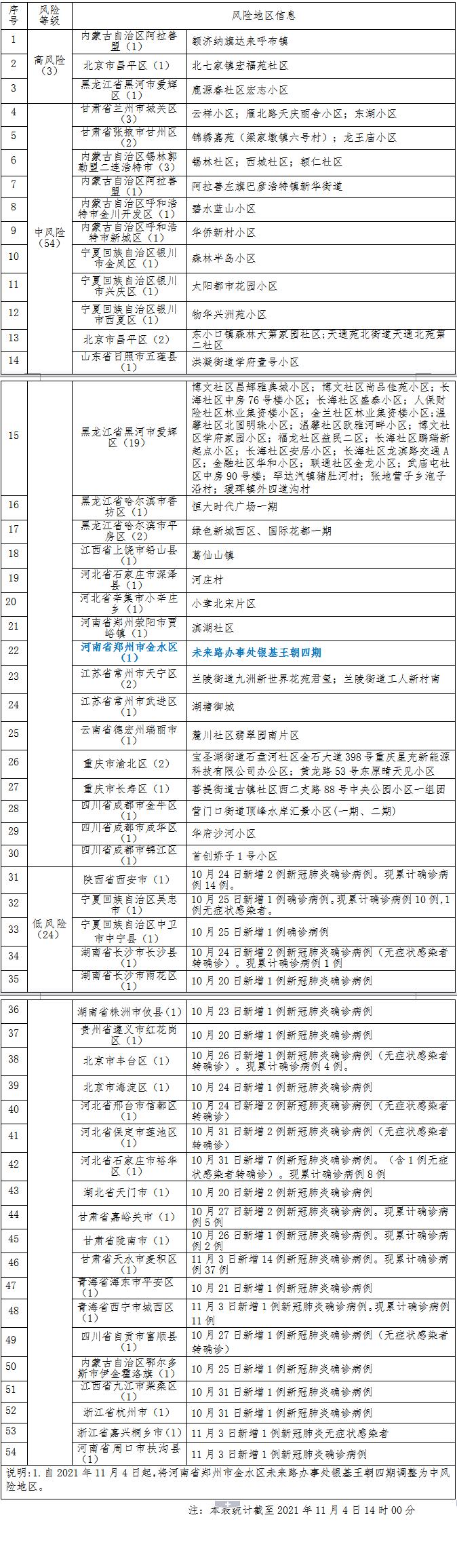 11月4日,郑州市新冠肺炎疫情防控指挥部决定,自2021年11月4日起,将金水区未来路办事处银基王朝四期调整为中风险地区。其他地区风险等级不变。