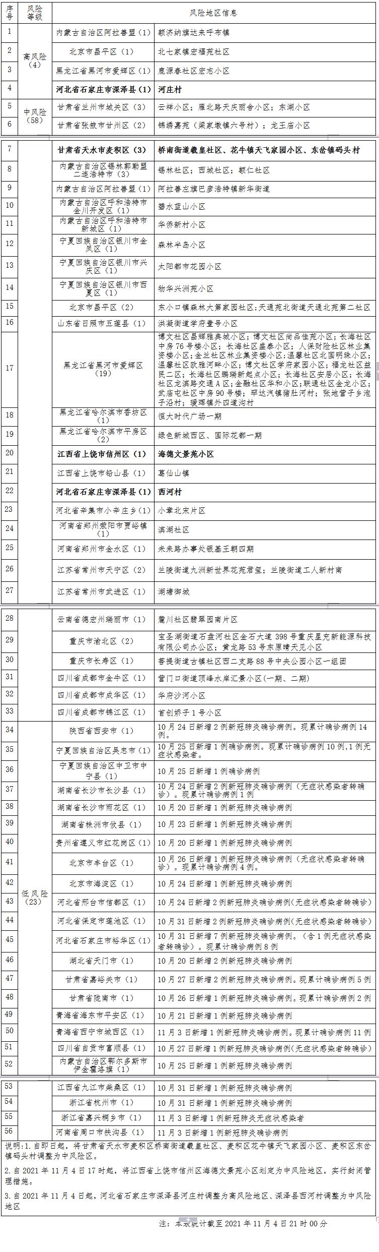11月4日起,河北省石家庄市深泽县河庄村调整为高风险地区;深泽县西河村调整为中风险地区。其他地区风险等级不变。
