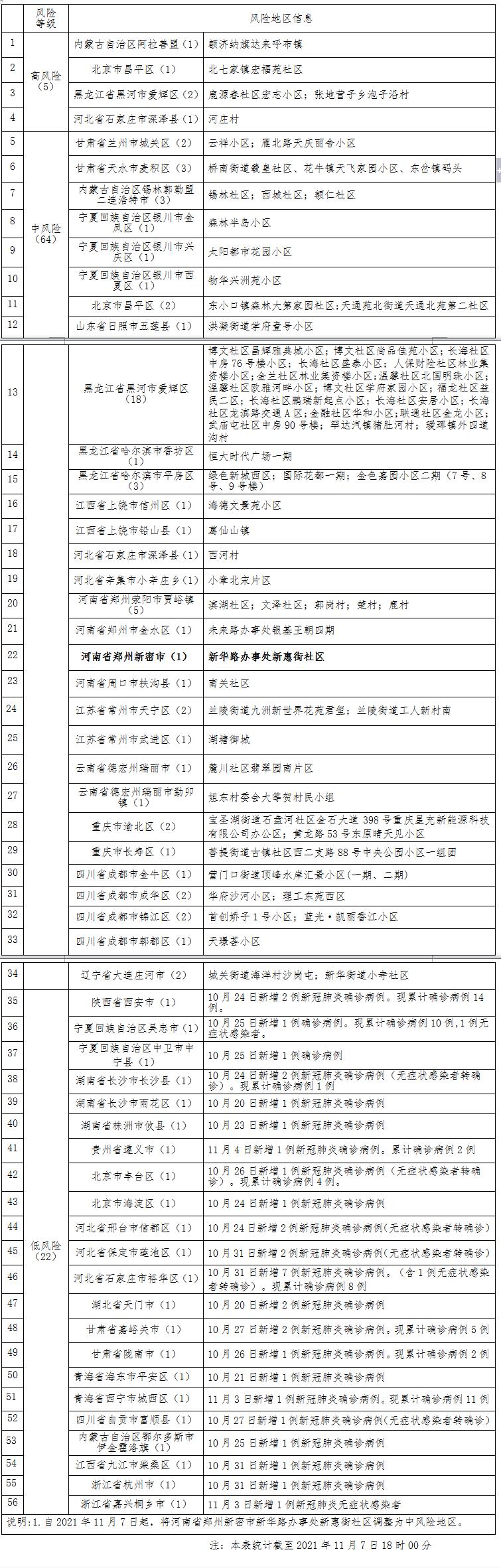 河南郑州市新冠肺炎疫情防控指挥部办公室通报,自2021年11月7日起,将河南省郑州新密市新华路办事处新惠街社区调整为中风险地区。其他地区风险等级不变。