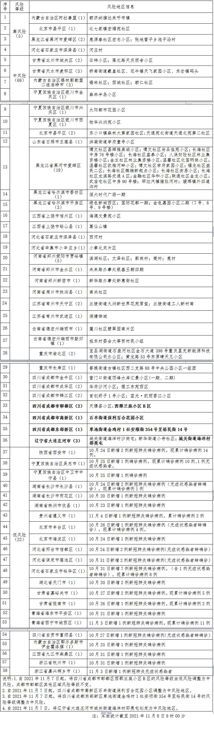 四川省卫健委通报,自2021年11月7日起,将四川省成都市郫都区西郡兰庭小区B区、四川省成都市高新区石羊街道保利百合花园小区、将四川省成都东部新区草池街道金鸡村1社安顺街354号至裕民街14号的风险等级调整为中风险。