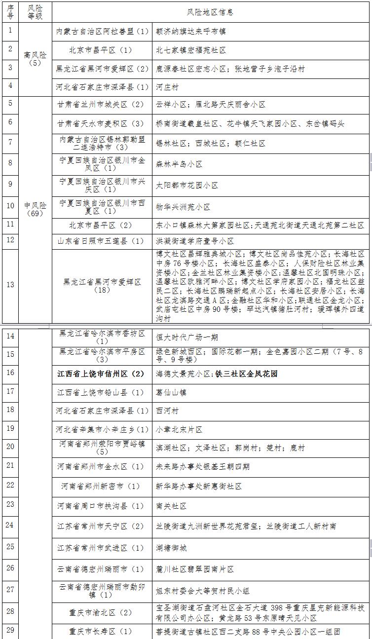 一、非必要勿前往江西省上饶市信州区铁三社区金凤花园及国内已公布的中高风险地区。如必须前往需提前向社区、村屯或属地疾控中心报备,同时做好个人防护。请与已公布病例轨迹有交集人员及近期有(辽宁省大连市庄河市,浙江省桐乡市,江苏省常州市、河南省郑州市新密市、金水区、荥阳市、周口市扶沟县,黑龙江黑河市、哈尔滨市香坊区、平房区,山东省日照市,北京昌平区、丰台区、海淀区,河北石家庄市、邢台市、保定市、廊坊市,甘肃张掖市、酒泉市、嘉峪关市、陇南市、天水市、兰州市,内蒙古自治区阿拉善盟、锡林郭勒盟二连浩特市、呼和浩特市、鄂尔多斯市,陕西西安市,宁夏回族自治区中卫市、银川市、吴忠市、青铜峡市,贵州遵义市,湖南长沙市、株洲市,湖北天门市,青海海东市、西宁市,云南省德宏州瑞丽市、陇川县、芒市,四川省自贡市、成都市郫都区、金牛区、成华区、锦江区、高新区、东部新区,新疆伊犁州霍尔果斯市、乌鲁木齐市、江西省上饶市铅山县、九江市柴桑区,重庆市九龙坡区、巴南区、渝北区、长寿区、沙坪坝区)等地旅居史人员主动报备。主动报告14天内活动轨迹及接触史,不参加集聚性活动,不去人员密集的公共场所,积极配合开展核酸检测及落实相关管控措施。若因不报备、不执行有关防控措施,影响疫情防控工作,将依法追究相应责任。