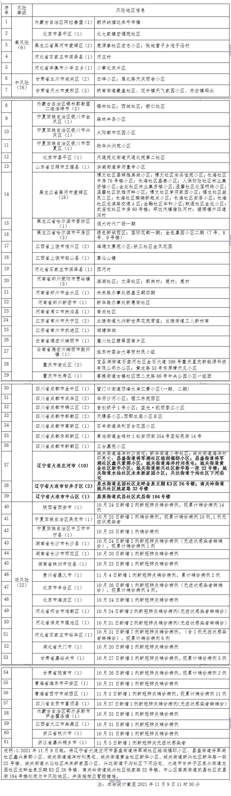 大连市新冠肺炎疫情防控总指挥部9日发布公告,自11月9日起,将辽宁省大连庄河市昌盛街道将军湖社区铭润福邸小区、昌盛街道将军湖社区鑫兴紫郡小区、城关街道海洋村刘亮屯、城关街道黄金社区新华小区、城关街道新兴社区新华路一段22号楼、城关街道水仙社区未来新家园小区、兴达街道干沟社区下河沿屯、大连市甘井子区泉水街道龙园社区龙畔金泉五期K3区26号楼、南关岭街道姚兴社区姚家路32号楼、中山区葵英街道武昌社区武昌街184号楼划定为中风险地区,并实施相应管控措施。