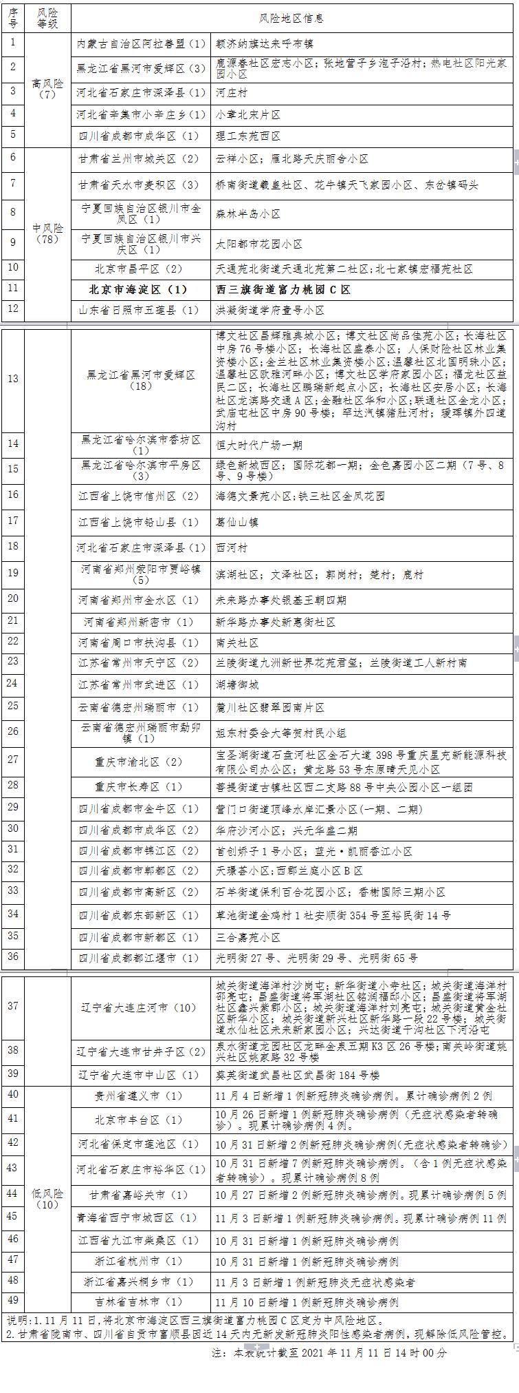 11月11日,在北京市新型冠状病毒肺炎疫情防控工作第258场新闻发布会通报,11月10日23时至11日11时,北京市新增6例本土新冠肺炎确诊病例和1例无症状感染者。自11月11日起,将北京市海淀区西三旗街道富力桃园C区定为中风险地区。
