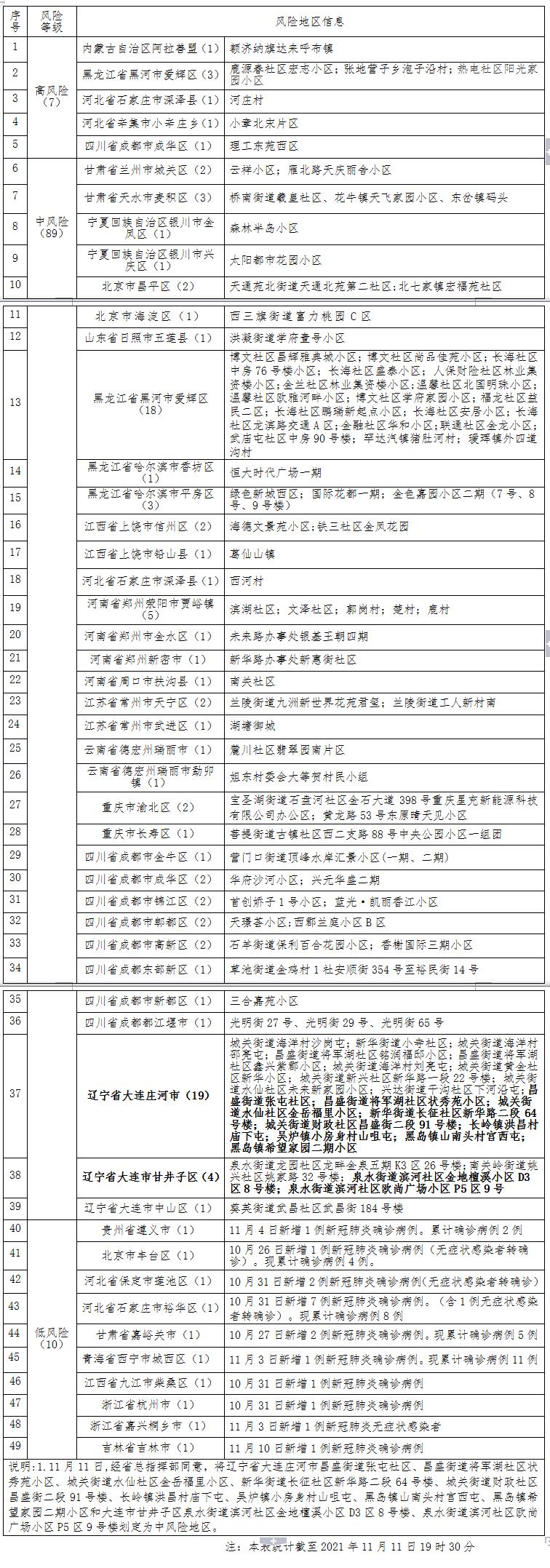 大连市新冠肺炎疫情防控总指挥部11日发布公告,11月11日,经省总指挥部同意,将辽宁省大连庄河市昌盛街道张屯社区、昌盛街道将军湖社区状秀苑小区、城关街道水仙社区金岳福里小区、新华街道长征社区新华路二段64号楼、城关街道财政社区昌盛街二段91号楼、长岭镇洪昌村庙下屯、吴炉镇小房身村山咀屯、黑岛镇山南头村宫西屯、黑岛镇希望家园二期小区和大连市甘井子区泉水街道滨河社区金地檀溪小区D3区8号楼、泉水街道滨河社区欧尚广场小区P5区9号楼划定为中风险地区。