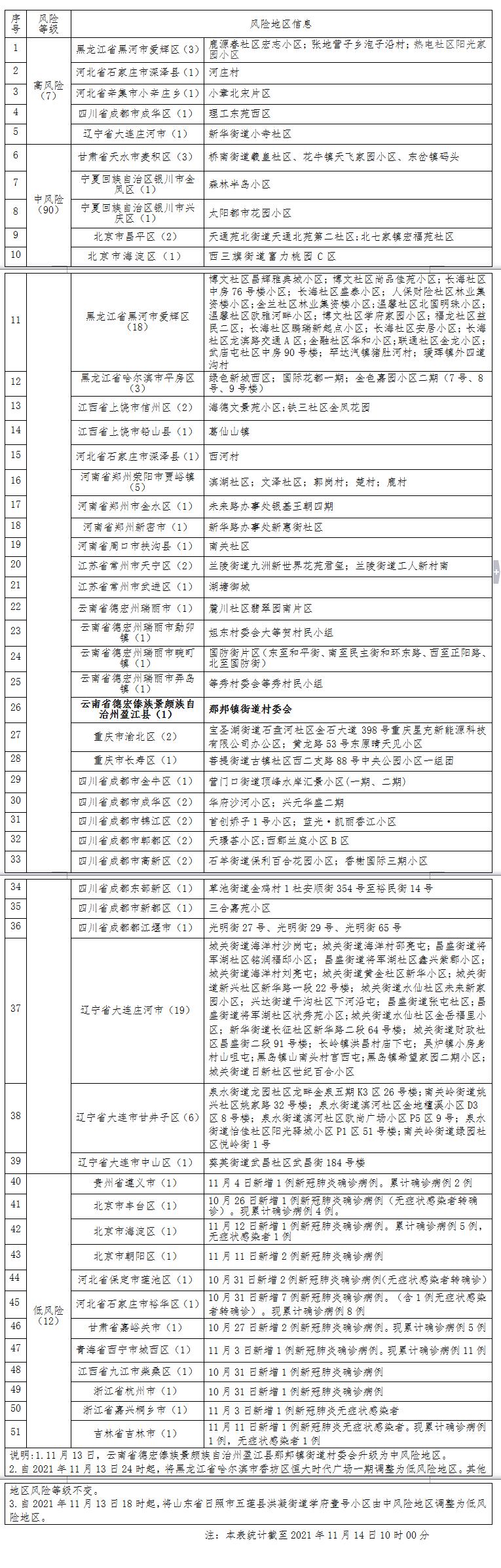 自2021年11月13日起,云南省德宏傣族景颇族自治州盈江县那邦镇街道村委会升级为中风险地区。