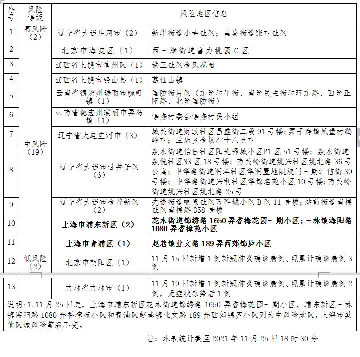 11月25日, 经上海市新冠肺炎疫情防控工作领导小组办公室研究决定,将浦东新区花木街道锦绣路1650弄香梅花园一期小区、浦东新区三林镇海阳路1080弄香樟苑小区和青浦区赵巷镇业文路189弄西郊锦庐小区列为中风险地区,上海市其他区域风险等级不变。