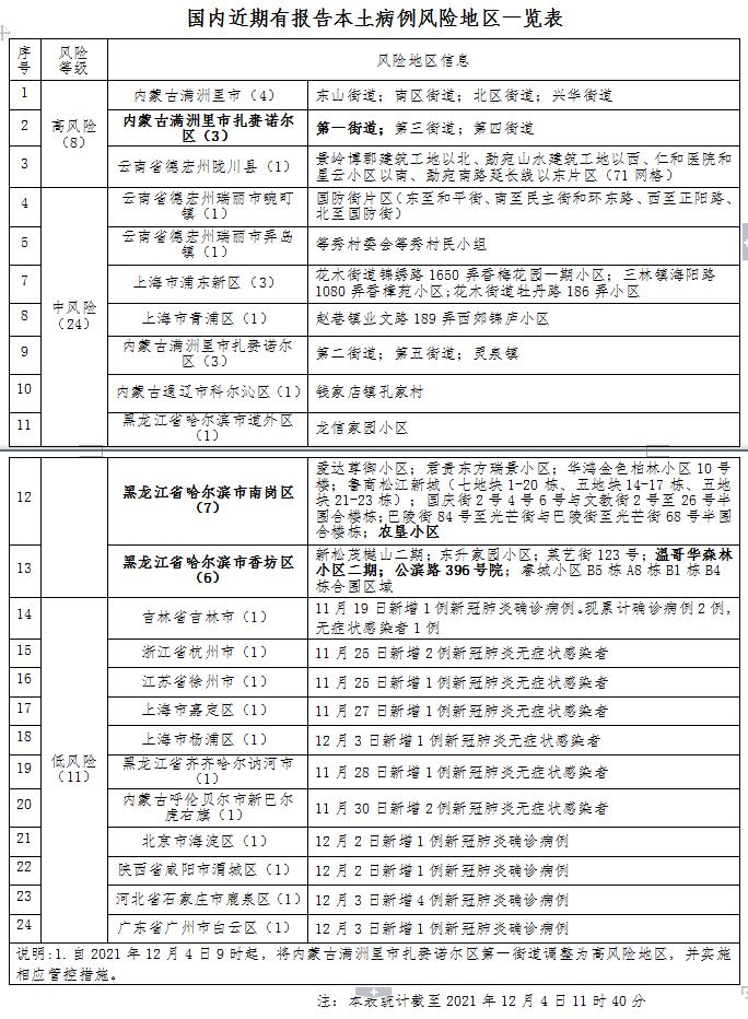 12月4日,内蒙古满洲里市新冠肺炎疫情防控指挥部(第61号)公告公布,自2021年12月4日9时起,将扎赉诺尔区第一街道调整为高风险地区,并实施相应管控措施。