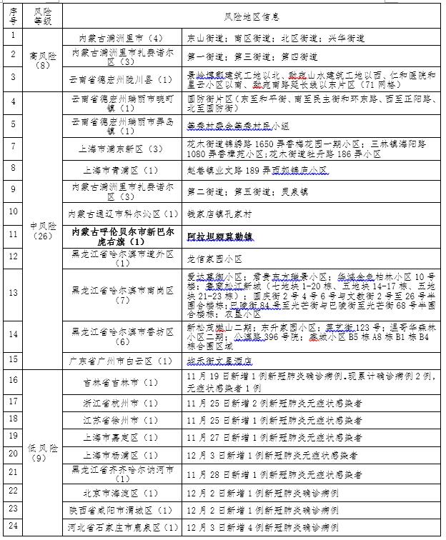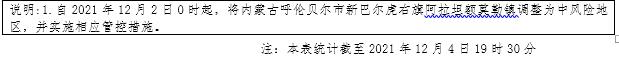 12月3日,新巴尔虎右旗新冠肺炎疫情防控指挥部通告(【2021年第23号】),自2021年12月2日0时起,将阿拉坦额莫勒镇调整为中风险地区,并实施相应管控措施。
