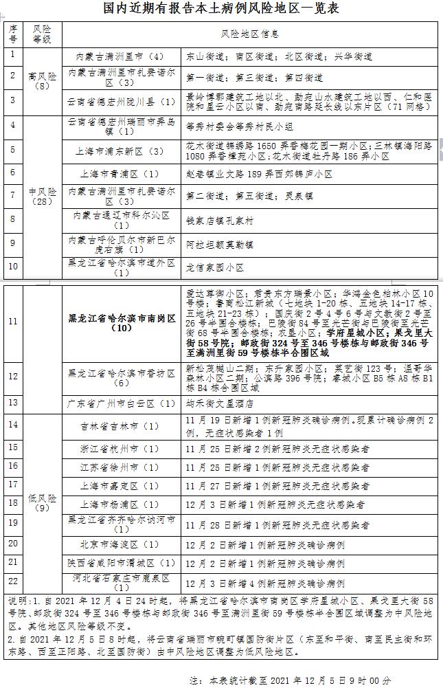 哈尔滨市应对新冠肺炎疫情工作指挥部通告,根据国务院联防联控机制有关规定,经专家咨询组综合评估研判,市指挥部决定,自2021年12月4日24时起,将南岗区学府星城小区、果戈里大街58号院、邮政街324号至346号楼栋与邮政街346号至满洲里街59号楼栋半合围区域调整为中风险地区。