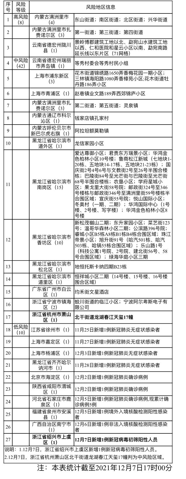 一、非必要勿前往浙江杭州市萧山区北干街道龙湖春江天玺17幢、有病例发生地区及国内已公布的高、中风险地区。如必须前往需提前向社区、村屯或属地疾控中心报备,同时做好个人防护。请与已公布病例轨迹有交集人员及近期有中高风险地区旅居史人员主动报备。主动报告14天内活动轨迹及接触史,不参加集聚性活动,不去人员密集的公共场所,积极配合开展核酸检测及落实相关管控措施。若因不报备、不执行有关防控措施,影响疫情防控工作,将依法追究相应责任。