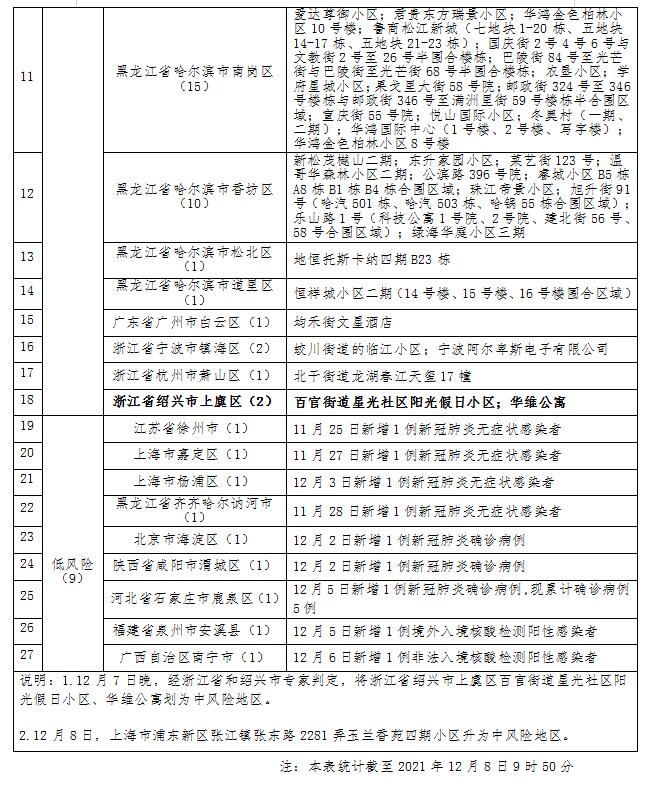 12月7日晚,经浙江省和绍兴市专家判定,将浙江省绍兴市上虞区百官街道星光社区阳光假日小区、华维公寓划为中风险地区。