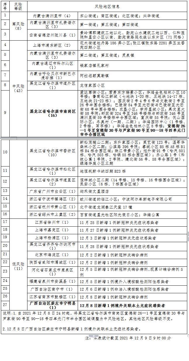 哈尔滨市应对新冠肺炎疫情工作指挥部决定,自2021年12月8日24时起,将黑龙江省哈尔滨市南岗区宣德街26—1号至宣德街30号与芦家街90号至90—18号四单元门市半合围区域调整为中风险地区。