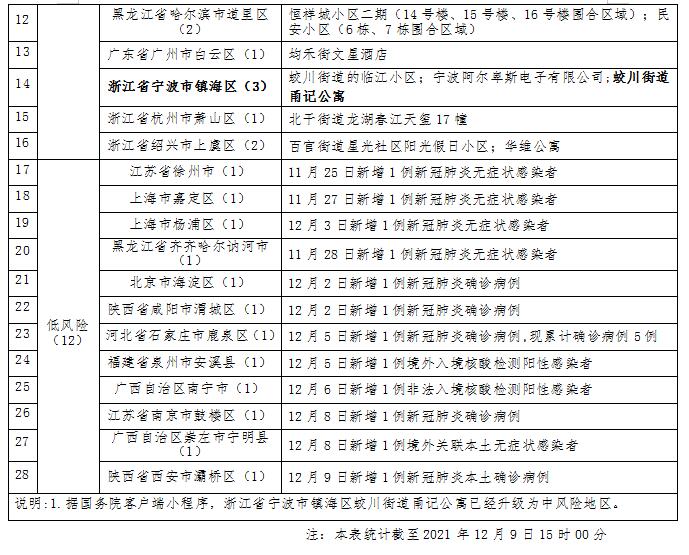 浙江省宁波市镇海区蛟川街道甬记公寓升级为中风险地区。
