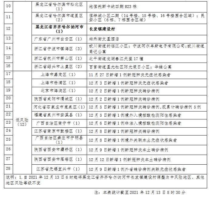 根据国务院联防联控机制有关规定,经专家组综合评判,黑龙江省齐齐哈尔讷河市疫情防控指挥部决定,自2021年12月13日6时起将长发镇建设村调整为中风险地区。