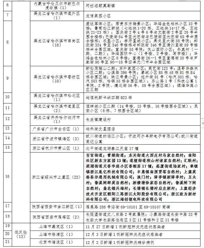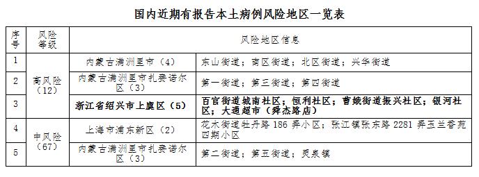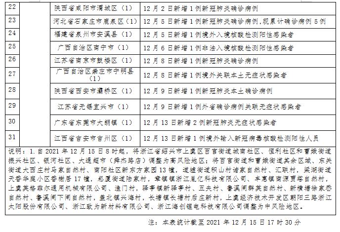 12月15日,浙江省绍兴市疫情防控联防联控指挥部发布通告,根据国务院联防联控机制有关规定,经省市专家综合评估研判,市疫情联防联控指挥部决定,自2021年12月15日8时起,将上虞区百官街道城南社区、恒利社区和曹娥街道振兴社区、银河社区、大通超市(舜杰路店)调整为高风险地区;