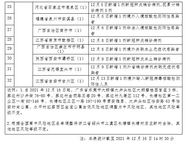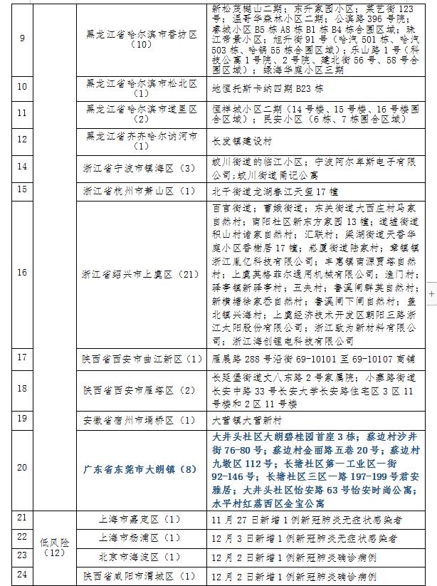 广东省东莞市根据国家和省关于应对新冠肺炎疫情分区分级防控的工作要求,经东莞市新冠肺炎防控指挥部同意,自2021年12月16日起,将大朗镇长富社区碧桂园首座3栋、蔡边村沙井街76-80号、蔡边村金丽路五巷20号、蔡边村九墩区112号、长塘社区第一工业区一街92-146号、长塘社区三区一路197-199号君安雅居、大井头社区怡安路63号怡安时尚公寓、水平村红荔西区金宝公寓由低风险地区调整为中风险地区。