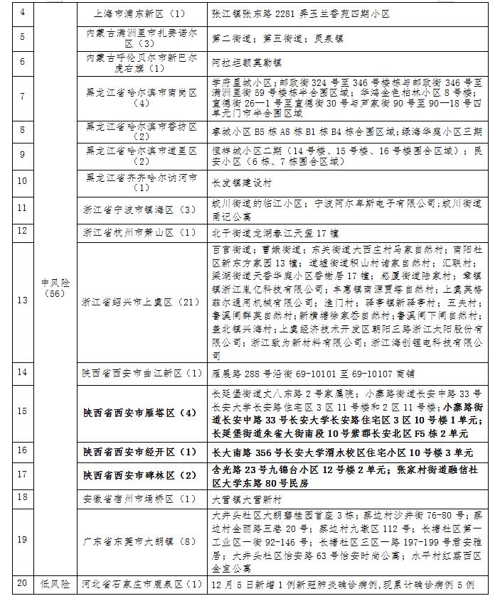 自2021年12月16日起,陕西省西安市经开区长大南路356号长安大学渭水校区住宅小区10号楼3单元、西安市碑林区含光路23号九锦台小区12号楼2单元、西安市雁塔区小寨路街道长安中路33号长安大学长安路住宅区3区10号楼1单元、西安市碑林区张家村街道融信社区大学东路80号民房、西安市雁塔区长延堡街道朱雀大街南段10号紫郡长安北区F5栋2单元,调整为中风险地区。