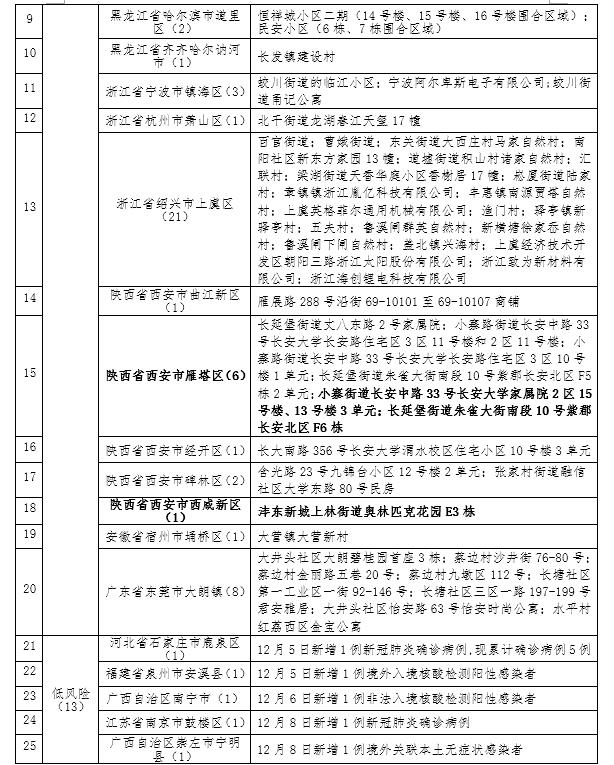 西安市新冠肺炎疫情防控指挥部研究决定:自2021年12月17日起,将西安市雁塔区小寨街道长安中路33号长安大学家属院2区15号楼、13号楼3单元;雁塔区长延堡街道朱雀大街南段10号紫郡长安北区F6栋;西咸新区沣东新城上林街道奥林匹克花园E3栋,调整为中风险地区。截止12月17日, 西安市中风险地区增至11个。