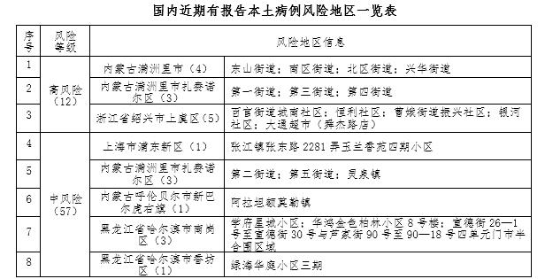 自2021年12月17日24时起,黑龙江省哈尔滨市将南岗区邮政街324号至346号楼栋与邮政街346号至满洲里街59号楼栋半合围区域,香坊区睿城小区B5栋A8栋B1栋B4栋合围区域调整为低风险地区。