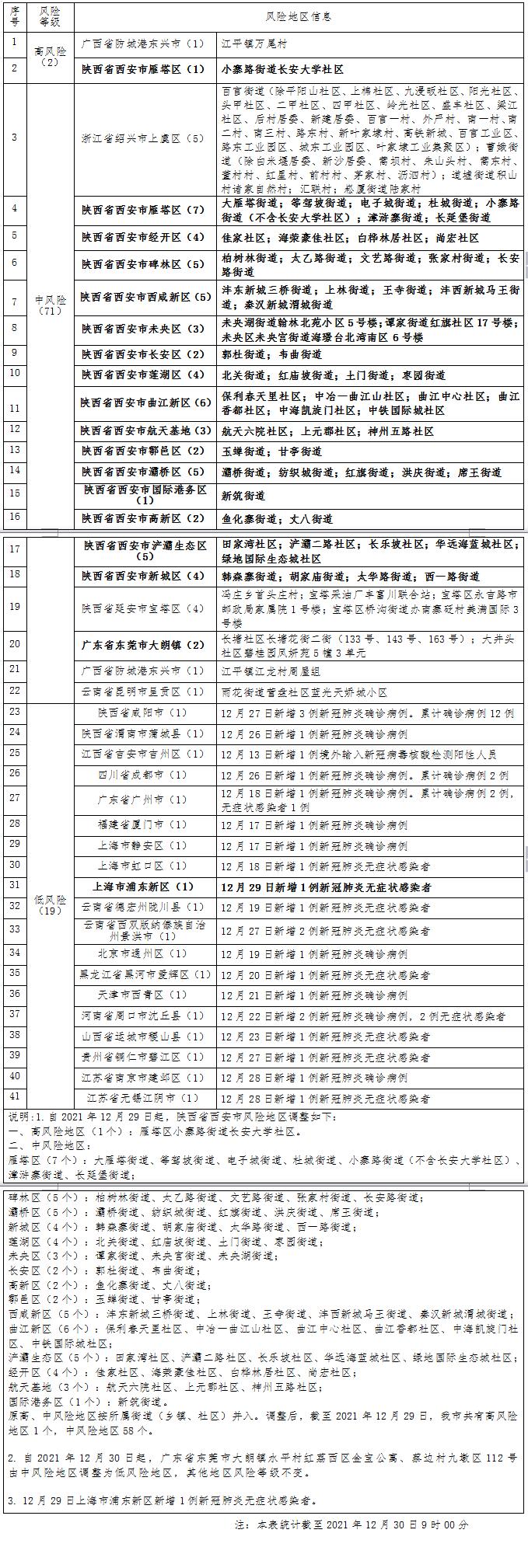 12月29日下午,陕西西安市新冠肺炎疫情防控新闻发布会通报,对西安市已公布的高、中风险地区按社区和街道为单位重新调整,调整后: