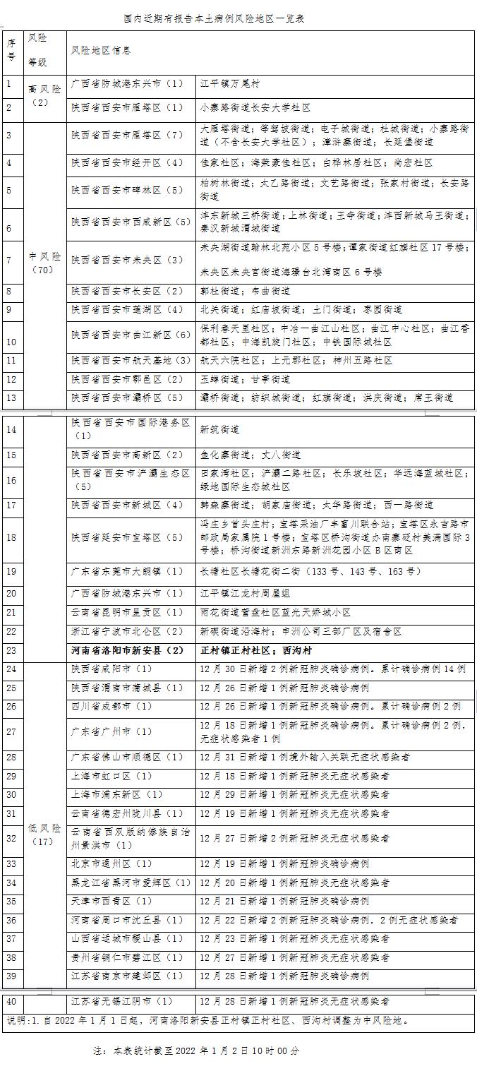 河南省洛阳市新安县新冠肺炎疫情防控指挥部决定,自2022年1月1日起,河南省洛阳市新安县正村镇正村社区、西沟村调整为中风险地区。