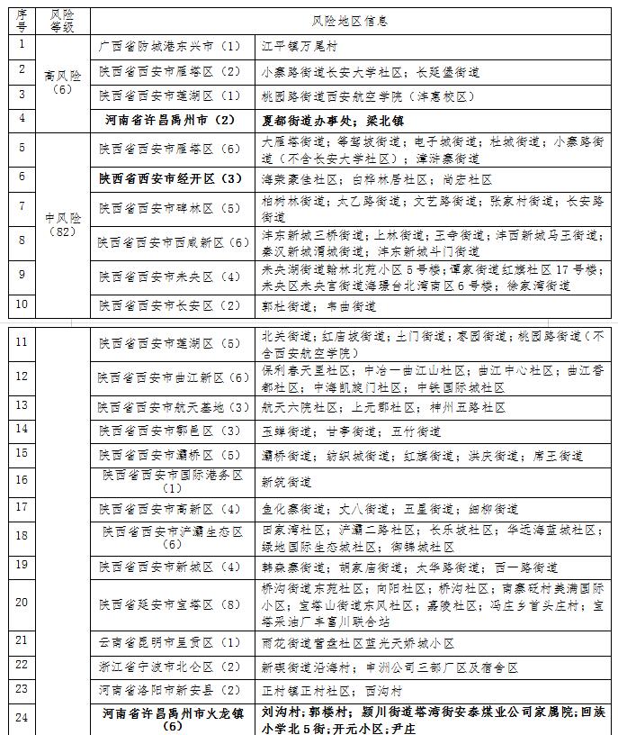 据国务院关于应对新冠肺炎疫情分区分级防控工作要求,结合河南禹州市实际情况,经禹州市疫情防控指挥部研究,自2022年1月4日起,对部分区域疫情风险等级进行调整:夏都街道办事处,梁北镇调整为高风险区域;火龙镇刘沟村、郭楼村,颍川街道塔湾街安泰煤业公司家属院,回族小学北5街,开元小区,尹庄调整为中风险区域。