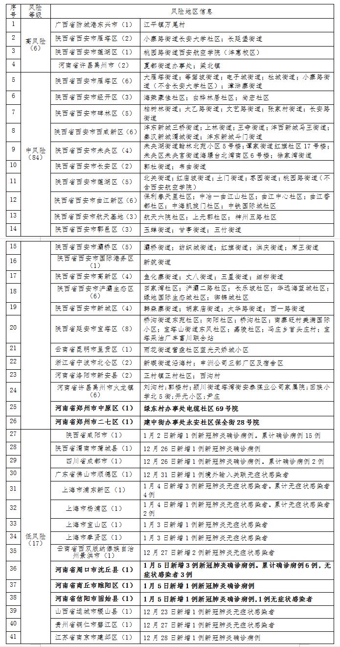 目前,全国现有高风险地区6个、中风险地区84个。