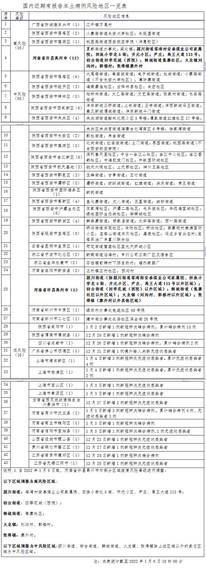 自2022年1月6日起,河南省许昌禹州市对部分区域疫情风险等级进行调整:颍川街道的塔湾村安泰煤业公司家属院、回族小学北5街、开元小区、尹庄、禹王大道113号;钧台街道的四季花城(西院);韩城街道的焦寨社区;火龙镇的刘沟村、郭楼村;张得镇的寨外村。以上区域调整为高风险区域。